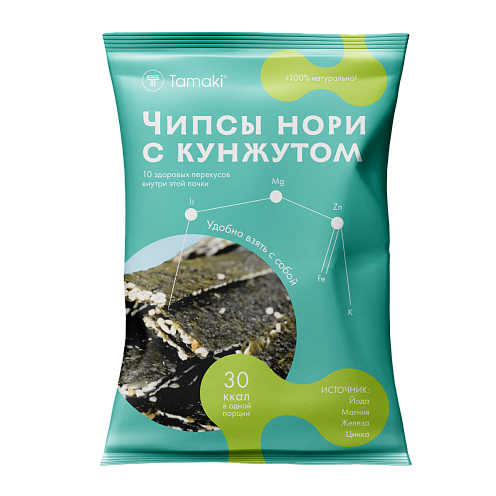 С чипсами Tamaki полезный перекус станет доступным для всех: студентов, веганов, спортсменов, гурманов. Используй в качестве ингредиента правильного питания, чтобы обогатить повседневный рацион йодом и витамином С. Чипсы нори с кунжутом Tamaki твоя идеальная компания в дороге, на учёбе, в кино, спортзале.